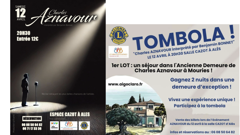 Lors de cette soirée, participez à notre grande tombola et tentez de gagner un week-end de rêve dans l'ancienne demeure de Charles Aznavour ! Imaginez-vous marcher dans les pas de ce géant de la chanson Française.
